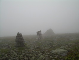 The weather was cold, raining, and nasty, but we had no choice but to hike on for seven miles to the safety of Madison Hut, because camping on the summit of Mount Washington wasn't allowed. I could only see fifty feet into the white cloud as we left the summit.